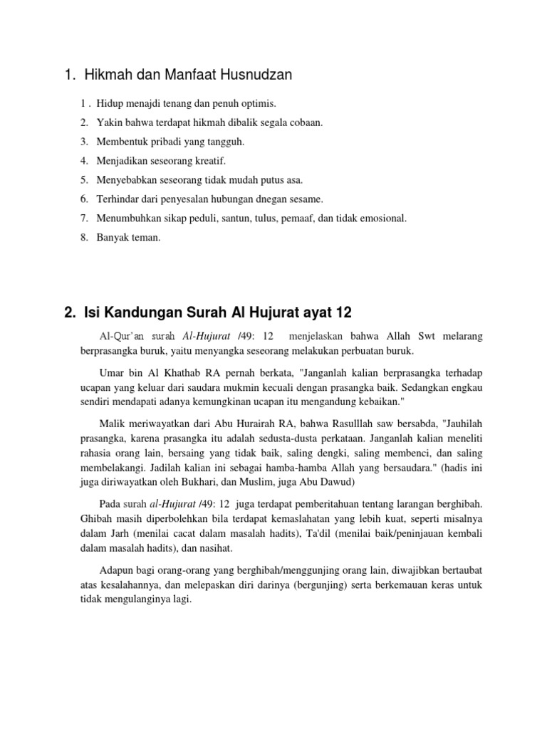 Inilah kandungan surat al hujurat ayat 12 Ilustrasi Alquran Surat Al Hujarat ayat 12. Pada kesempatan kali ini admin akan membahas tentang isi kandungan surat al hujurat ayat 12 tentang husnuzan atau berprasangka baik. Alquran menyimpan banyak hikmah dan pelajaran bagi siapa saja yang membaca dan memahaminya. Pelajari jugaayat dan kandungan surat al hujurat ayat 12 Pada bab ini juga kita akan membahas tentang pengertian husnuzan macam macam husnuzan hikmah husnuzan dan cara membiasakan diri untuk husnuzan.